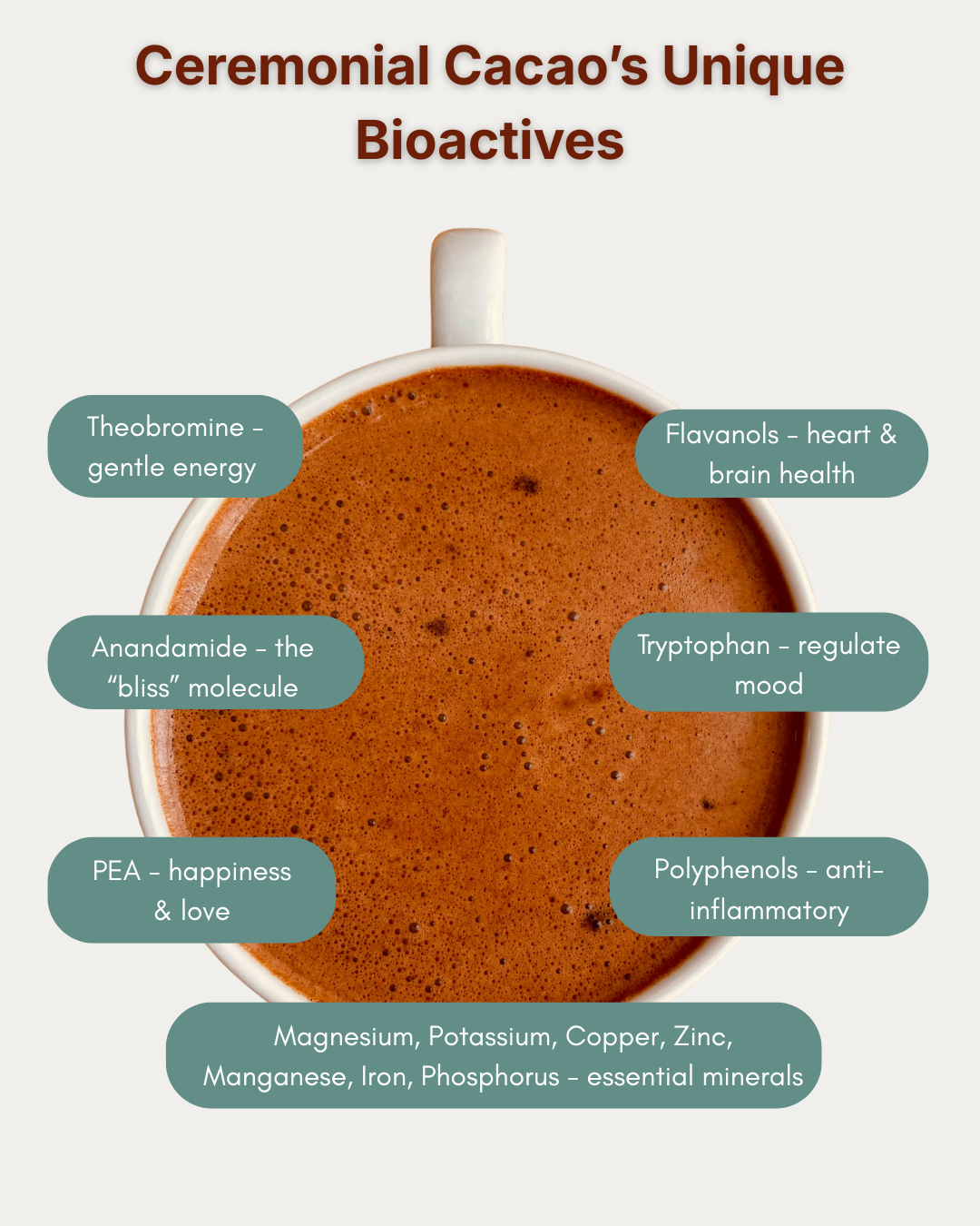 Theobromine and PEA in cacao increase blood flow and dopamine activity in the brain, enhancing focus, creativity, and flow